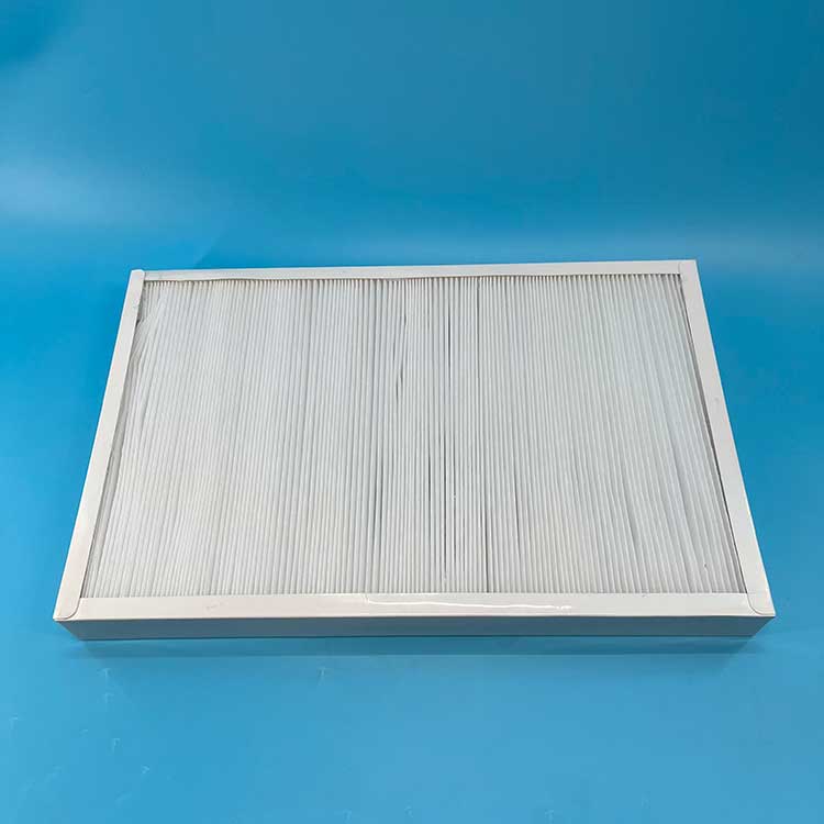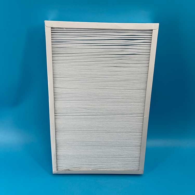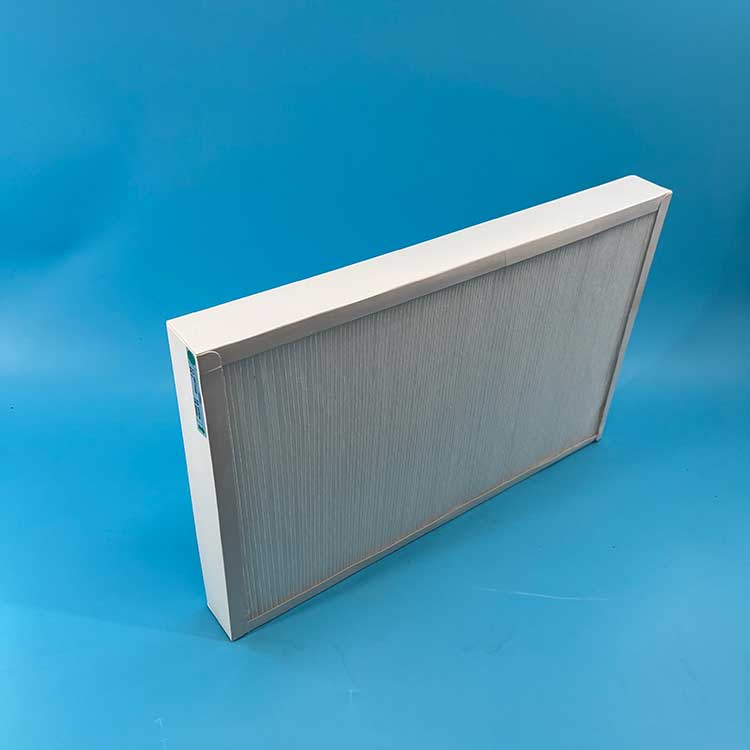 過(guò)濾材料是以折疊形式裝入高強(qiáng)度模切硬紙板內(nèi),迎風(fēng)面積增大。流入的空氣中的塵埃粒子被過(guò)濾材料有效阻擋在褶與褶之間。潔凈空氣從另一面均勻流出,因此氣流通過(guò)過(guò)濾器是平緩和均勻的。視過(guò)濾材料不同,它所阻擋的粒徑從0.5μm到5μm而不同,過(guò)濾效率也不同 。